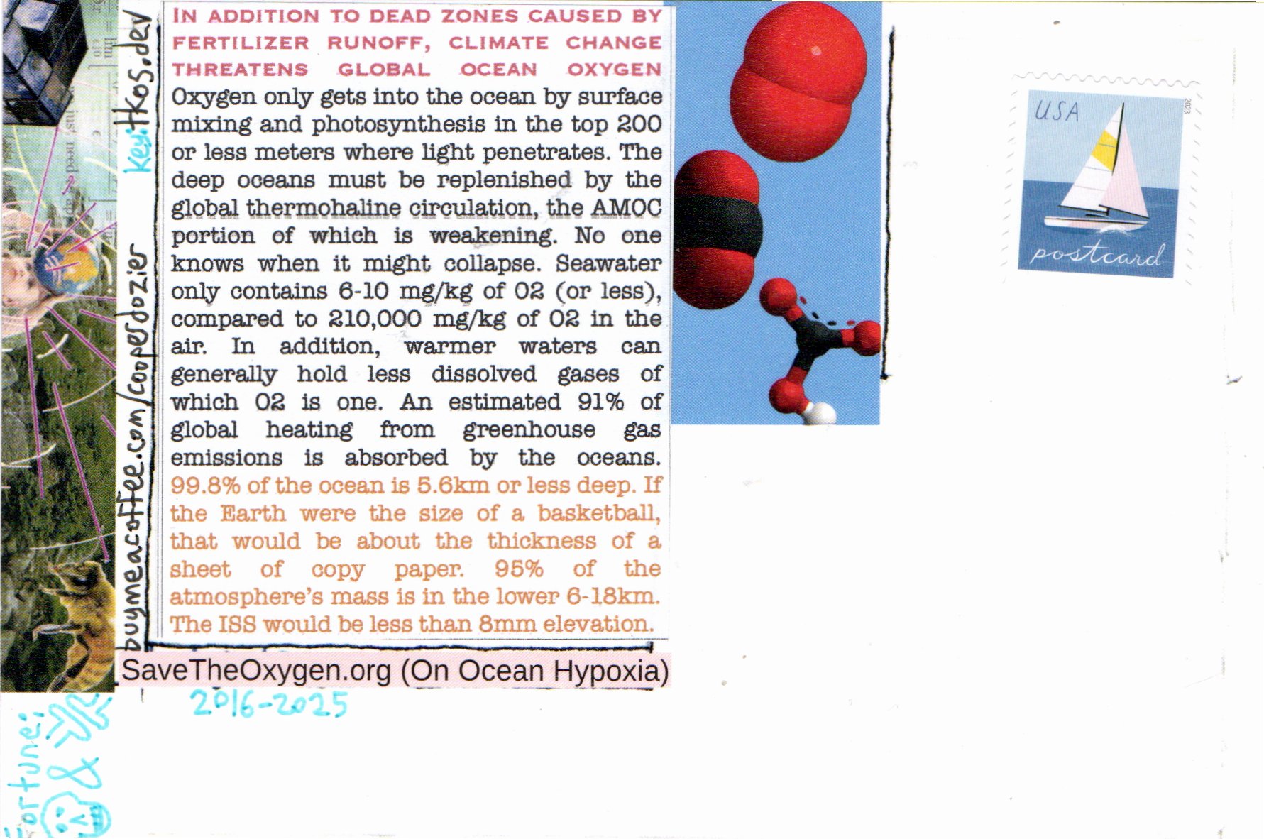 Oxygen only gets into the ocean by surface mixing and photosynthesis in the top 200 or less meters where light penetrates. The deep oceans must be replenished by the lobal thermohaline circulation, the AMOC [ Atlantic Meridional Overturning Circulation ] portion of which is weakening. No one knows when it might collapse. Seawater only contains 6-10 mg/kg of O2 (or less), compared to 210,000 mg/kg of O2 in the air. In addition, warmer waters can generally hold less dissolved gases, of which O2 is one. An estimated 91% of global heating from greenhouse gas emissions is absorbed by the oceans.