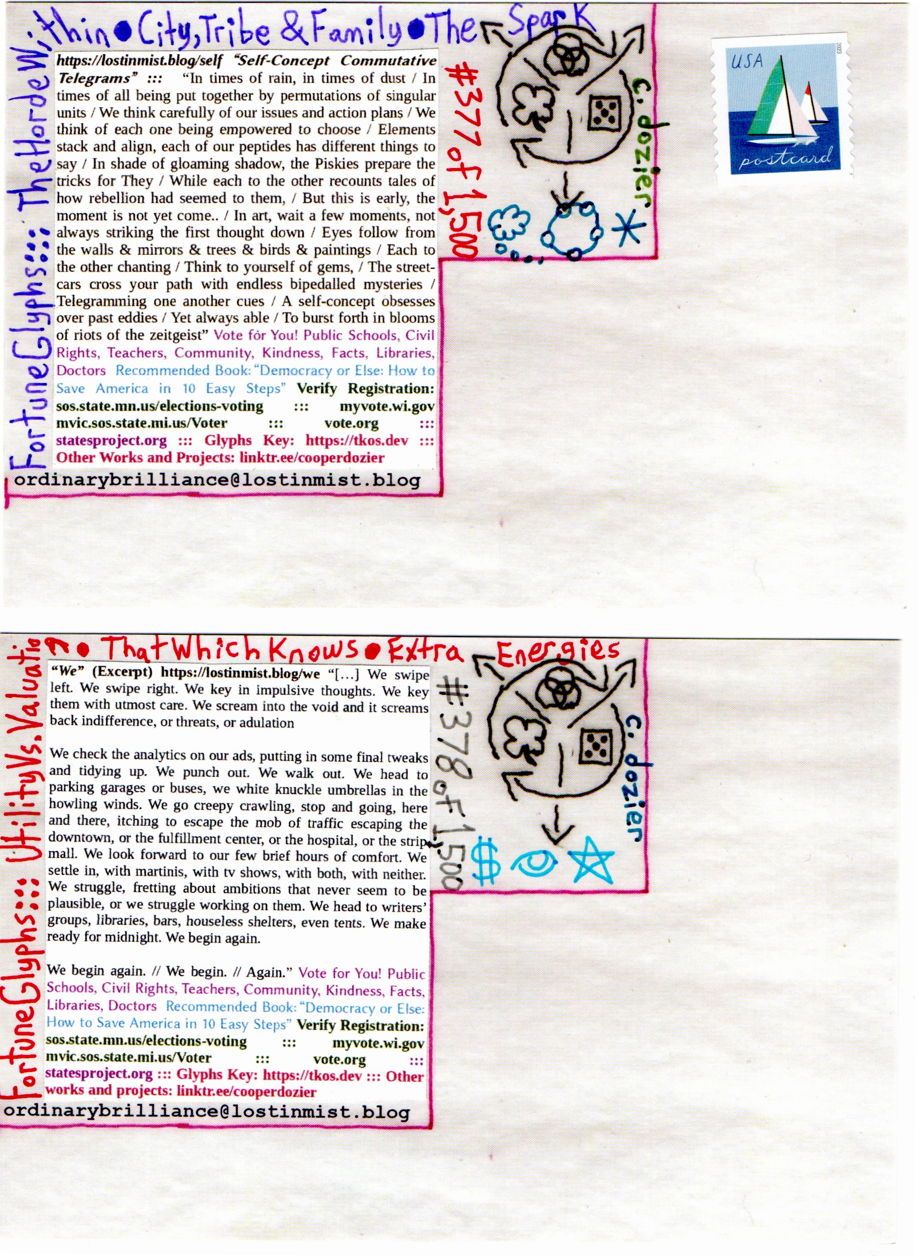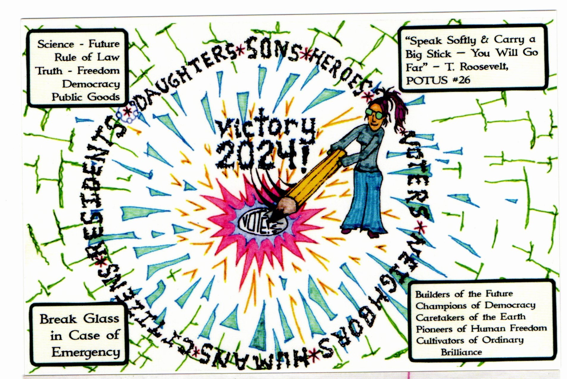 Since I started numbering and initialing them after #500 (may have miscounted somewhere and the numbers run a few dozen over 1,000). I think for my second printing I'm going to redraw the same thing but somewhat more refined, so that they will, in fact, be signed limited edition prints. Jury still out on if second printing will be 500 or 1,000. But... there will be runoffs and 2025 primaries, so even if I don't get through the second printing by election day they will still be relevant. The cards currently being sent out have excerpts from my poems "We", "Iris of the babbling brook Loquacia", and "The Set of Modernistic Identities" which can be found in whole at https://lostinmist.blog/we, https://lostinmist.blog/iris, and https://lostinmist.blog/set